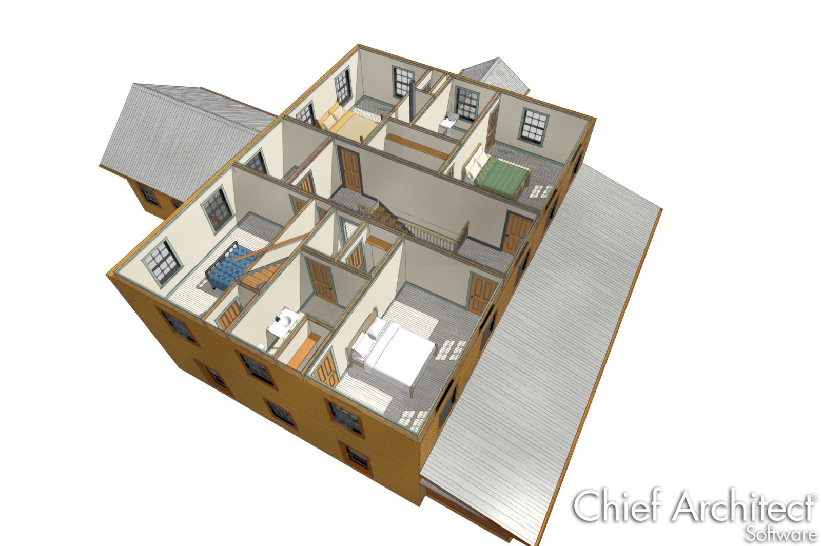 The four living spaces on the first floor and the four bedrooms on the second floor each occupy a corner of the home. This way each room has windows on two walls for views and cross ventilation. The mudroom annex offers a functional family entrance.