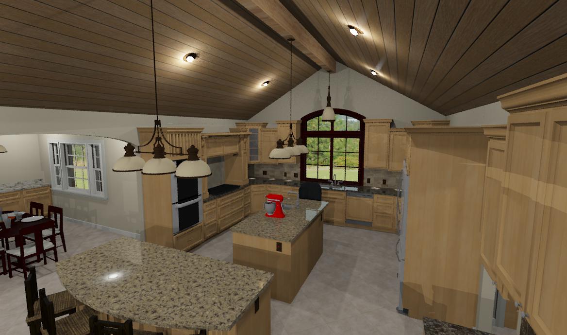 This is a project that will get underway soon. My neighbor's home suffered damage from a fire. The home was built about 50 years ago with the typical small openings between rooms. My design calls for large arched cased openings between the dining, kitchen, living room and entry. This is a kitchen addition that features a cathedral ceiling and the large casement window.