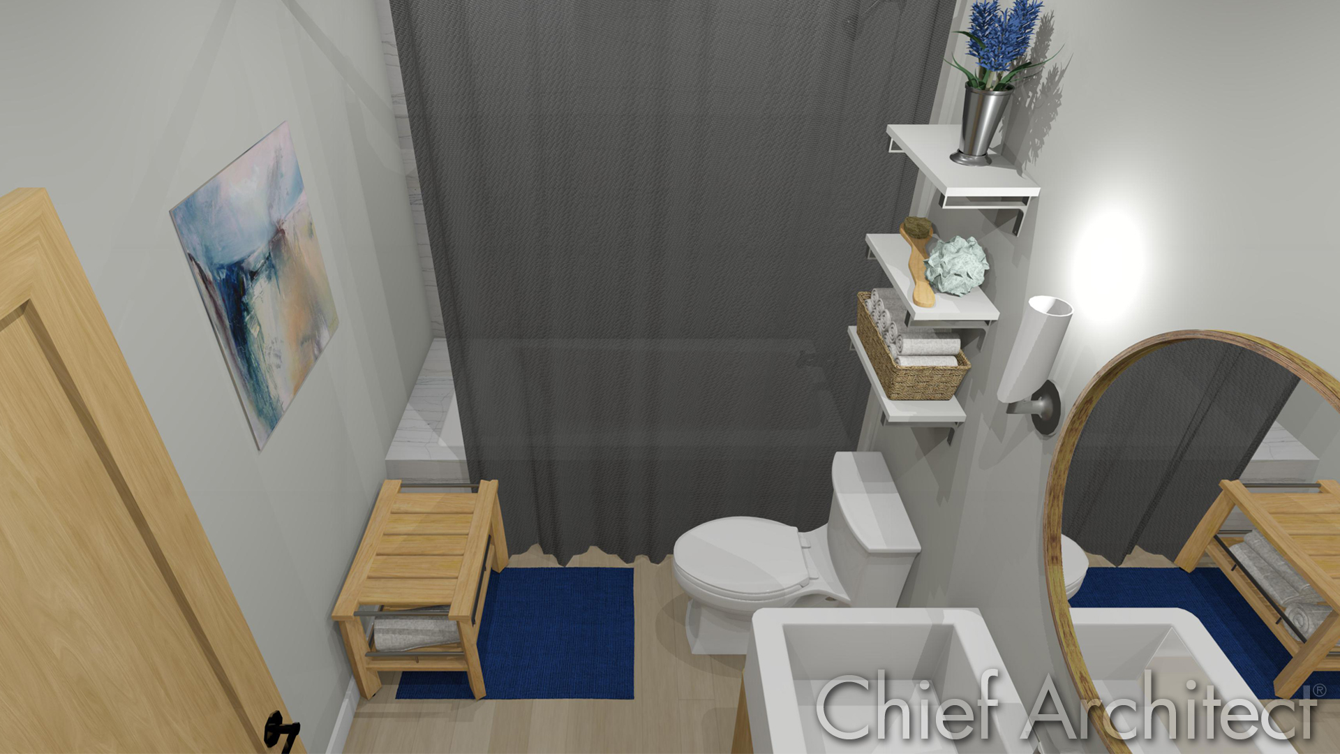 Blues, greys, warm woods, and accessories from bonus catalogs like Home Spa Accessories and Corbels and Brackets No.2 Shelving create a coastal feeling in this bathroom.
