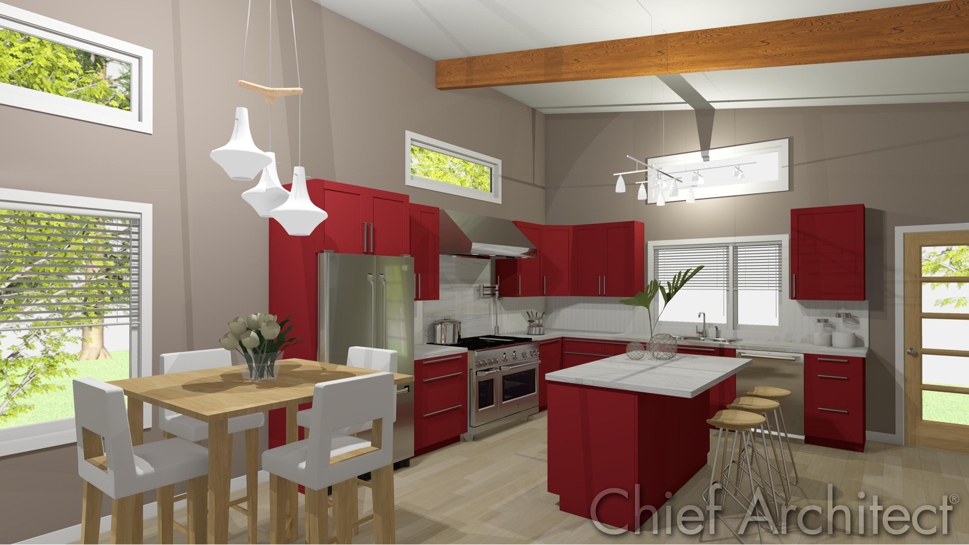 Stepping back through the open living space, we see room for a dinette set that flows from the kitchen. This version of the vaulted ceilings illustrates exposed beams under a shed roof.