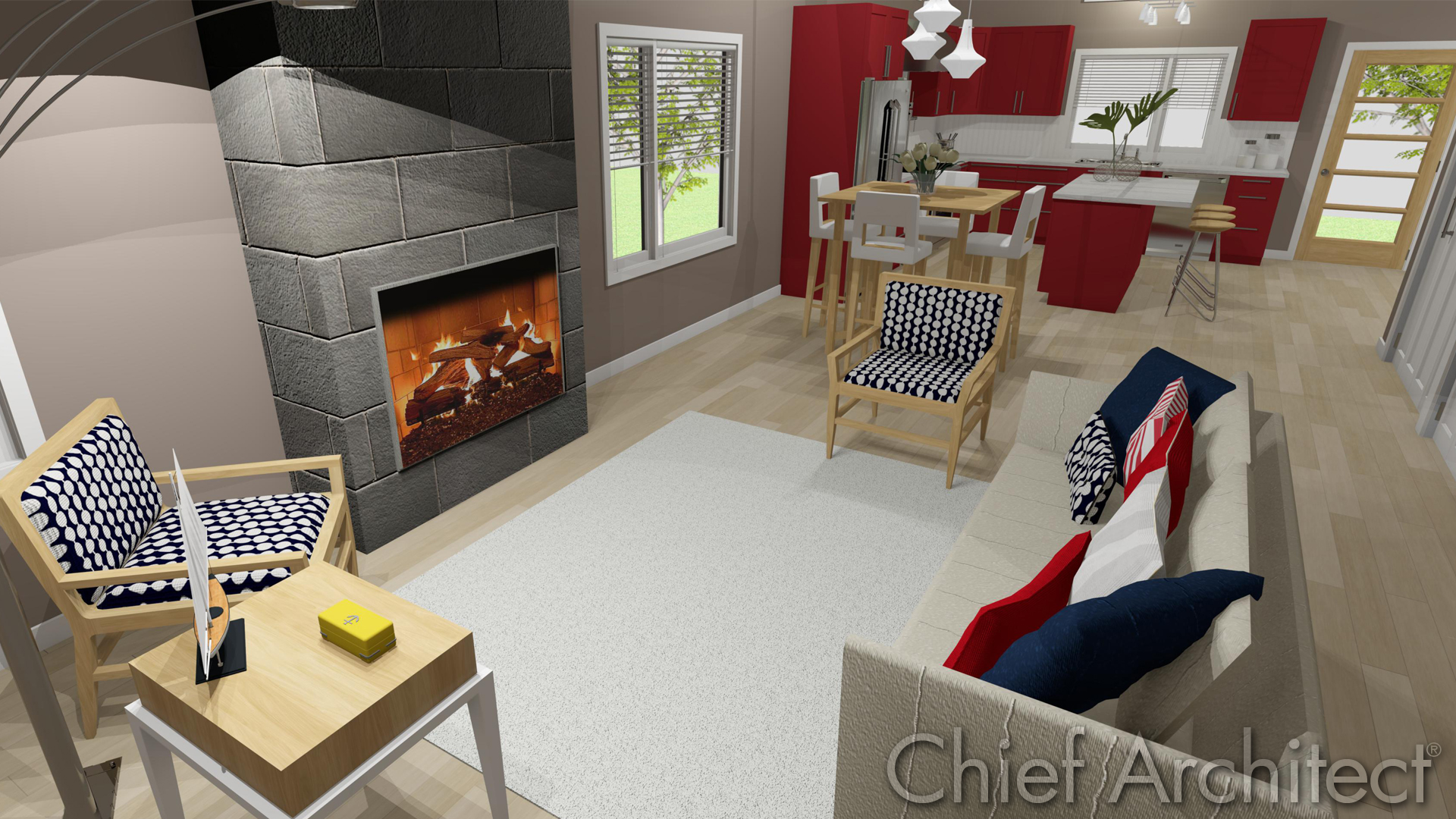 From the front of the house, near the front door, we look all the way down the length of the living space. This version show an optional fireplace, creating a welcoming living room.