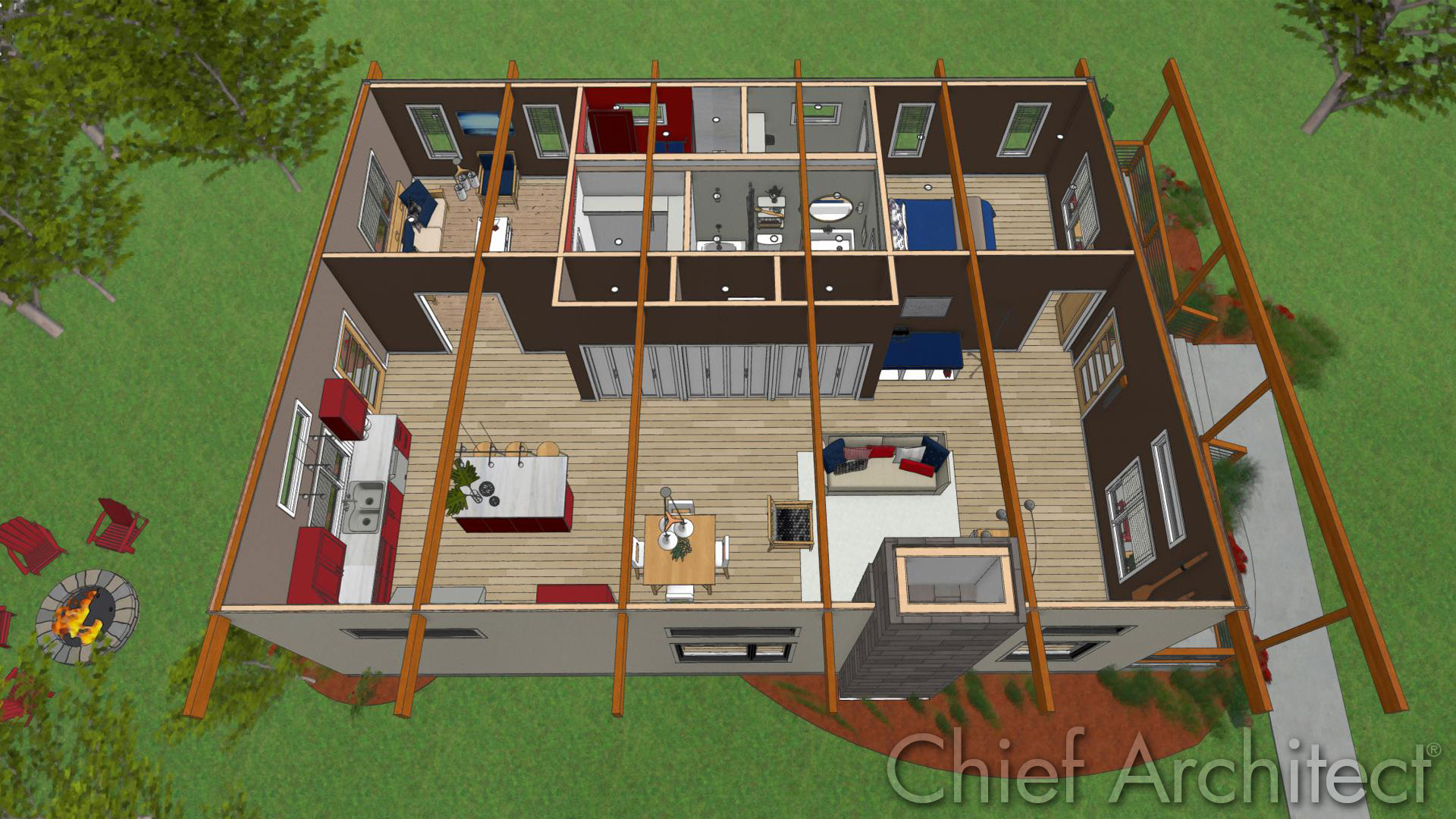 This view can be easily created in Chief Architect using the Full Overview Camera. We made a new layer set to be used in the camera view that turns off the display of the roof components and ceiling surfaces so we can peek inside the space. The Watercolor Rendering Technique, with Line Drawing turned on, gives this image a more artistic look instead of striving for photo realism.