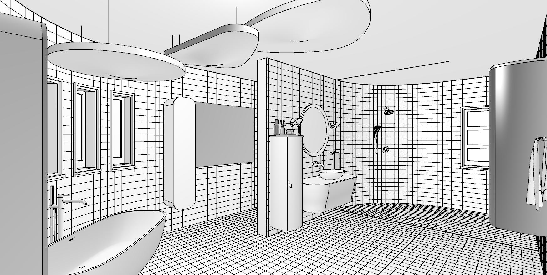 Retro Bathroom - Technical Perspective View B&W