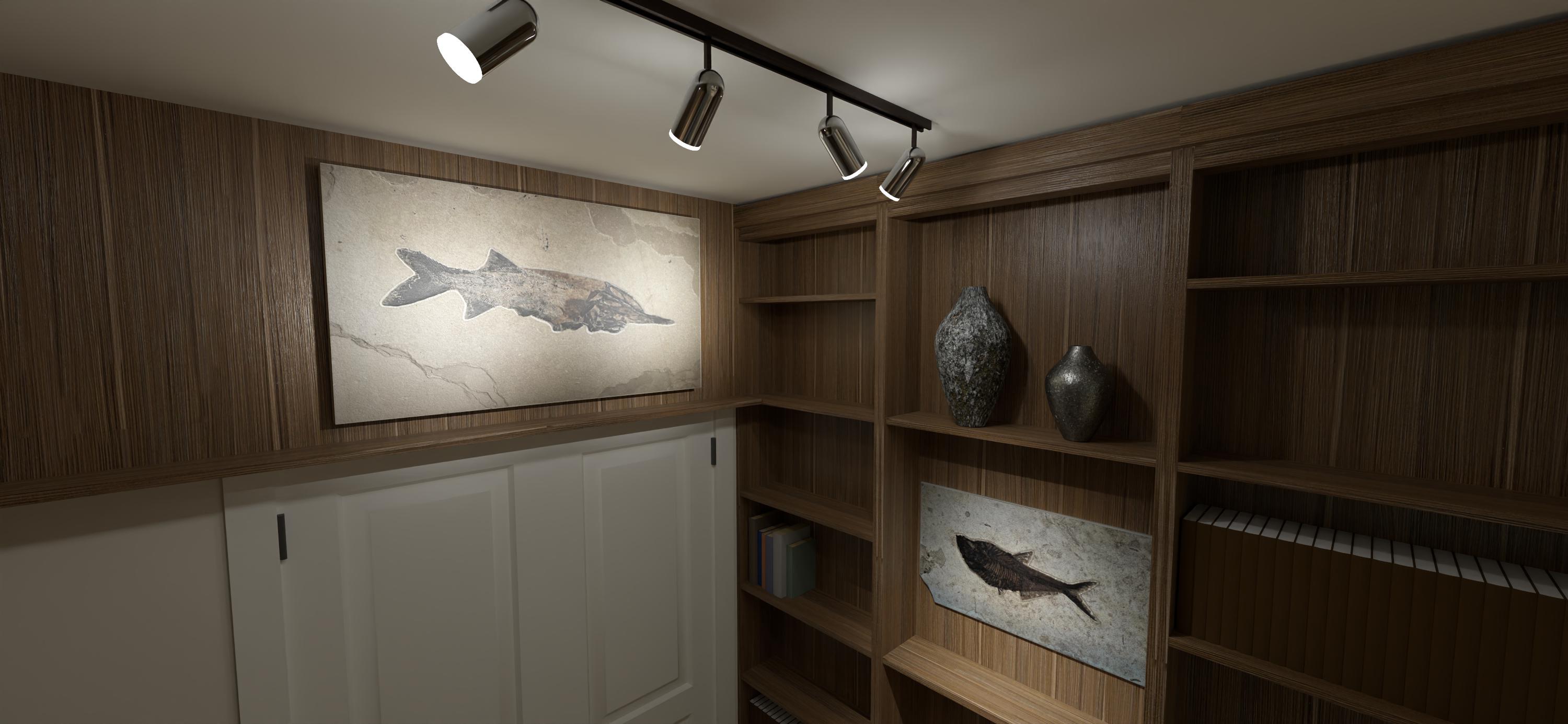 Hoff_Design 26 Posted June 8, 2025 On the track light, I used a sphere and a couple of of cylinders. The part that is lit is set with the lighting white and is adding area light to the room (set at 2500) each. Then I added a directional spot light for each of the track lights which is lighting up the fossils. It worked. With the track lights I can point each of the lights where ever I want them using plan and elevation views.(Still have to adjust the lighting data in the lighting dialogue box though to adjust the angle of the spot lights) Link to comment