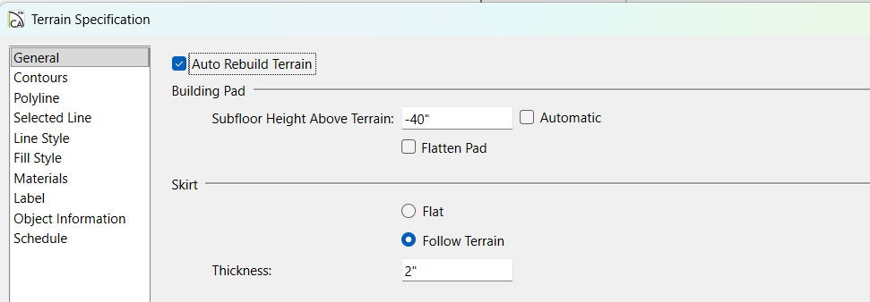 SHCanada2 Posted yesterday at 01:56 AM Share Posted yesterday at 01:56 AM (edited) you have a terrain point midway on the left at -151 for a reference point I took a measurement from that to the patio slab which is at -14in (aboslute elevation)to the top, or put another way, its top is 14" below the top of your subfloor. My measurement from top of slab to roughly where that elevation point is (I took a cross section at the elevation point marker): is about 109 inches. the elevation point should then be 40+14+109, 163, but its only 151..interesting you can also double check the elevation of that point(below) by looking at the toolbar. Mine shows z at -123, which would be 109+14 I did switch the terrain to skirt of 2" and follows terrain to take these measurents. I never use the Flat skirt personnally That said, Essentially your terrain point is putting the terrain at -151" below the terrain reference point. And because your intended main floor to terrain is less that 151 you have to raise the terrain above the main floor (which would be a negative number for the "subfloor height above terrain")) A question would be, where does the -151 for the terrain point come from and what is it's reference, sea level? something else? Edited 23 hours ago by SHCanada2 1 Link to comment Share on other sites More sharing options...
