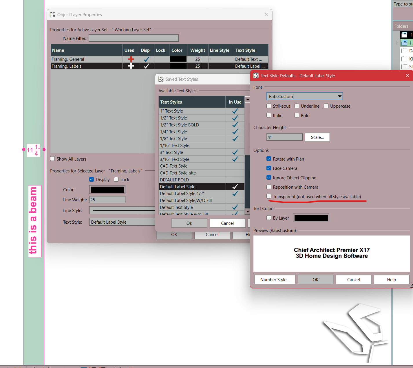 DBCooper Posted 13 hours ago Share Posted 13 hours ago Robert is correct that you can't get the beam label to display on top of the joists since the beam is under the joists. Labels always display in the same drawing level that the owner object displays. You could rotate it 90 degrees but TBH I would probably just create manual text for this case. Your picture still looks like your beam label is transparent though. Not sure how you are getting that if you unchecked "transparent" for the label text style. Link to comment Share on other sites More sharing options...