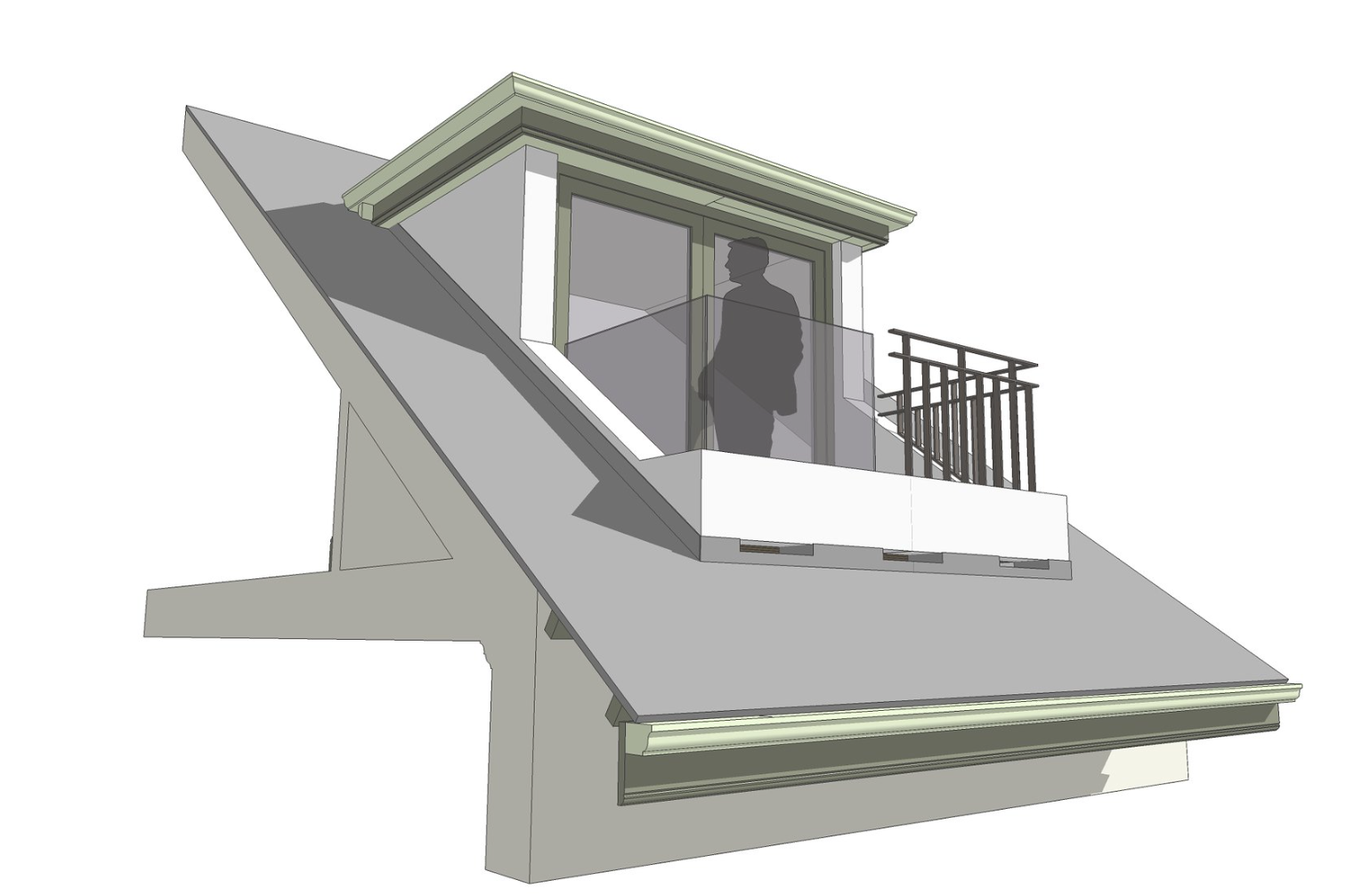 GeneDavis Posted 6 hours ago Share Posted 6 hours ago (edited) I made a house with enough roof area to do what I wanted, then manually cut a hole in the roof and built the dormer walls connected to interior walls so as to have it be a "room" with a ceiling and roof over, then used a different wall type to draw the three balcony walls, and manually adjusted their shapes. It's a mess, but it's a start. You can use the window tool, pass-through type, to make the scuppers. If you can shape windows into a trapezoid, you can shape pass-throughs. I think the glass and metal railings will need to be modeled manually using whatever you like. Solids would be my choice. Others might use cabinets. Edited 5 hours ago by GeneDavis Link to comment Share on other sites More sharing options...