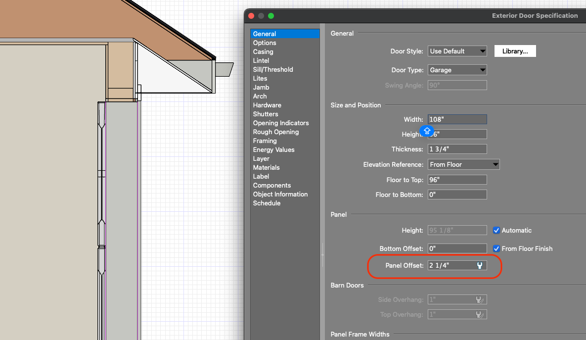 Chrisb222 Posted 2 hours ago Share Posted 2 hours ago 34 minutes ago, SAWConstruction said: Is it possible to "move" the door towards the inside of the building I set the Panel Offest for this door to 2-1/4" to get it to clear: 1 Link to comment Share on other sites More sharing options...